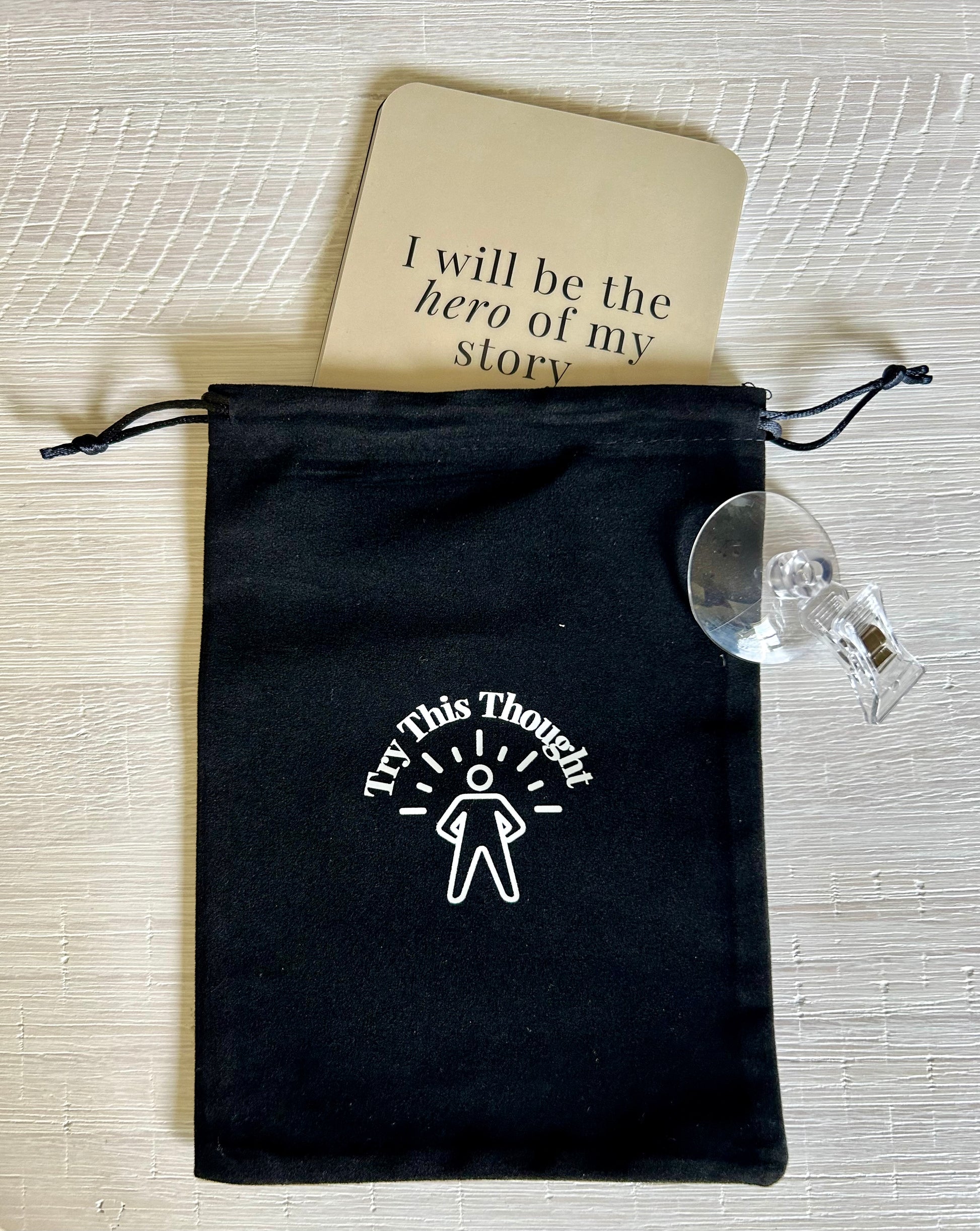 5 Unique Thought Cards (4x5), suction cup clip for mirror, storage bag