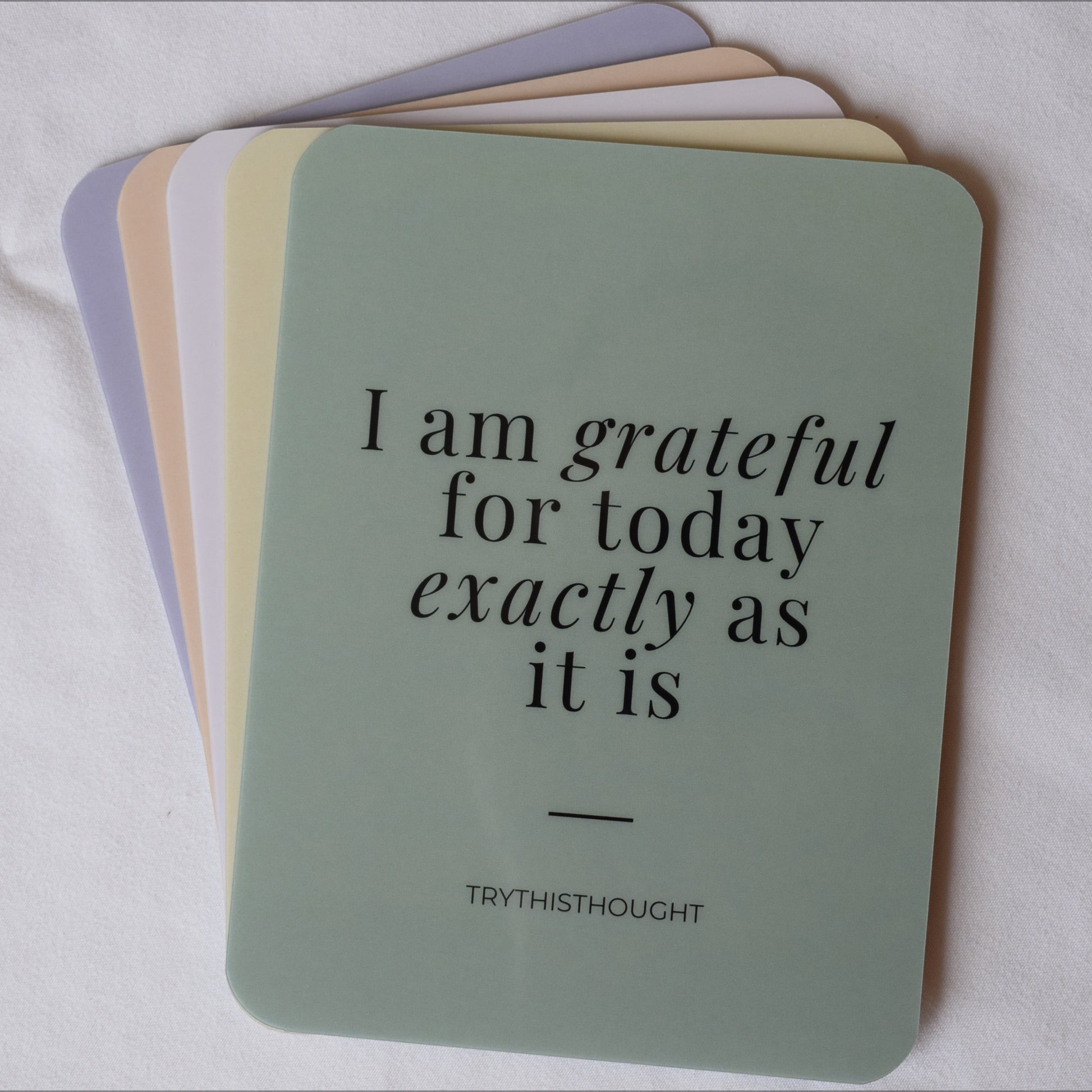 5 Unique Thought Cards (4x5), a suction cup clip for mirror, and a storage bag