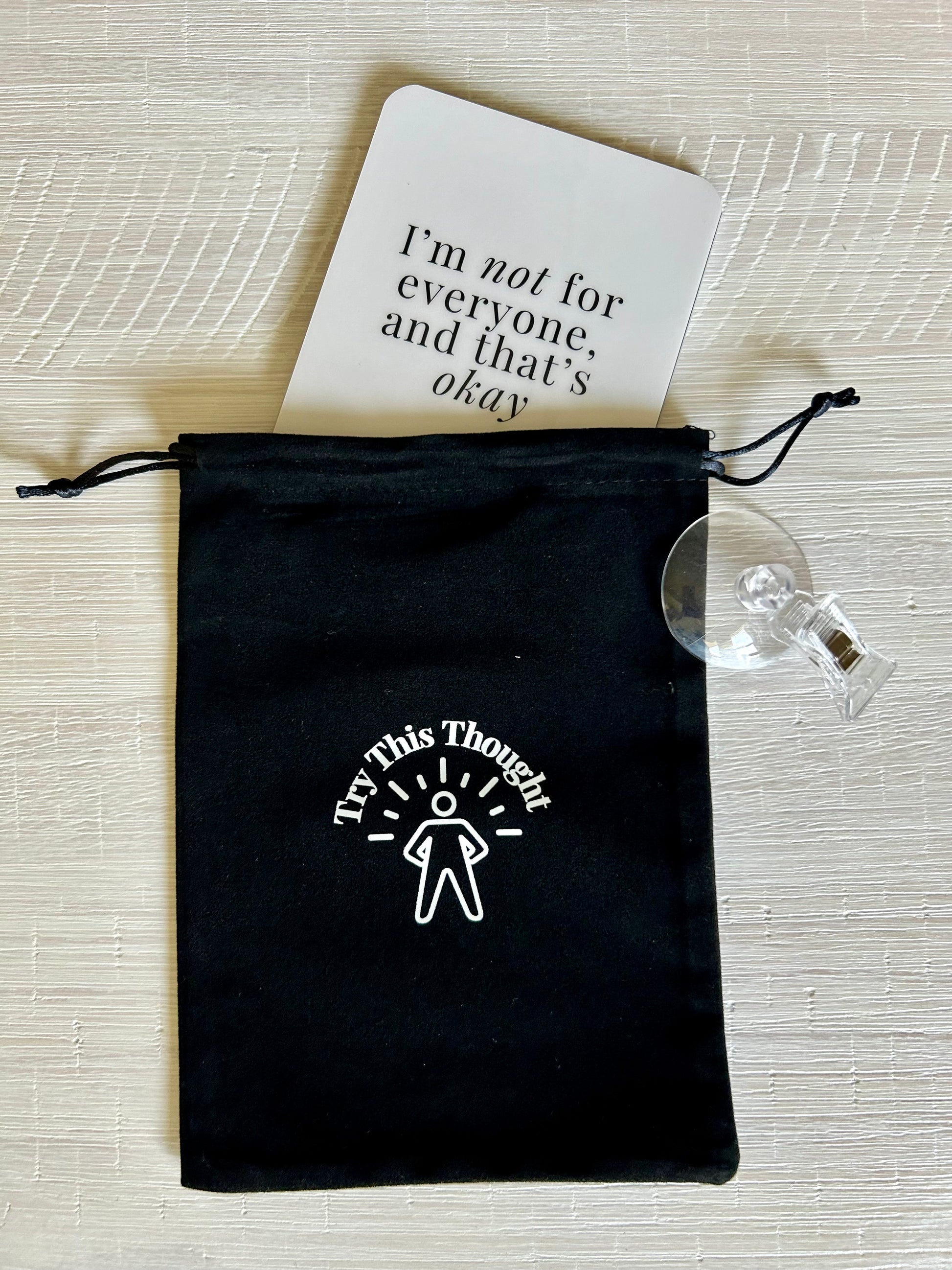 5 Unique Thought Cards (4x5), a suction cup clip for mirror, and a storage bag